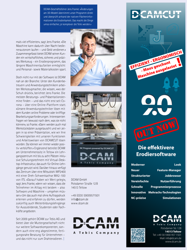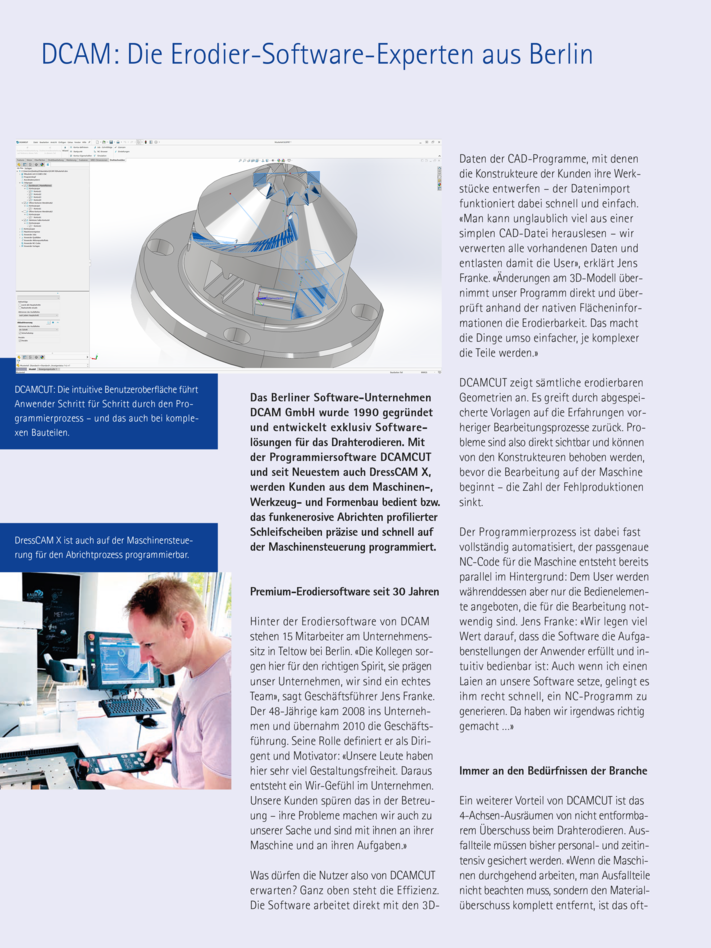 Hinter der Erodiersoftware von DCAM stehen 15 Mitarbeiter am Unternehmenssitz in Berlin-Teltow. «Die Kollegen sorgen hier für den richtigen Spirit, sie prägen unser Unternehmen, wir sind ein echtes Team», sagt Geschäftsführer Jens Franke. Der 48-Jährige kam 2008 ins Unternehmen und übernahm 2010 die Geschäftsführung. Seine Rolle definiert er als Dirigent und Motivator: «Unsere Leute haben hier sehr viel Gestaltungsfreiheit. Daraus entsteht ein Wir-Gefühl im Unternehmen. Unsere Kunden spüren das in der Betreuung - Ihre Probleme machen wir auch zu unserer Sache und sind mit ihnen an ihrer Maschine und ihren Aufgaben.»