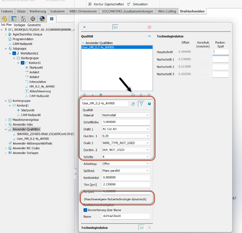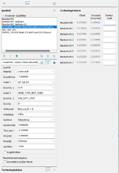 Aufgrund der Größe des Datenbestandes wird diese zur Verarbeitung in DCAMCUT, basierend auf den im Maschinendialog angegebenen Bearbeitungsparametern (Werkstückmaterial, Erodierdraht, Drahtstärke) reduziert und für die Qualitätsauswahl nur der entsprechende Datenbestand angeboten und als Herstellerdatenbank geladen.