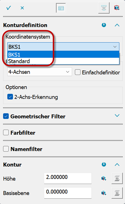 Ab dieser DCAMCUT Version ist das zugehörige Benutzerkoordinatensystem direkt im Konturdefinitionsdialog auszuwählen