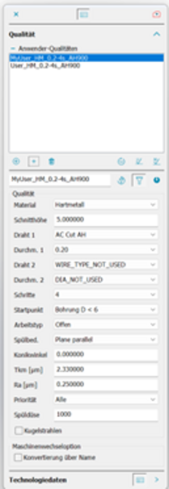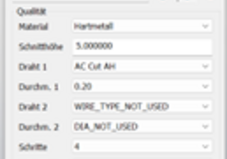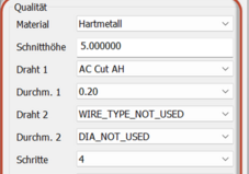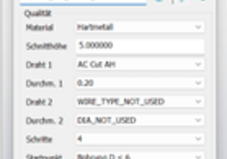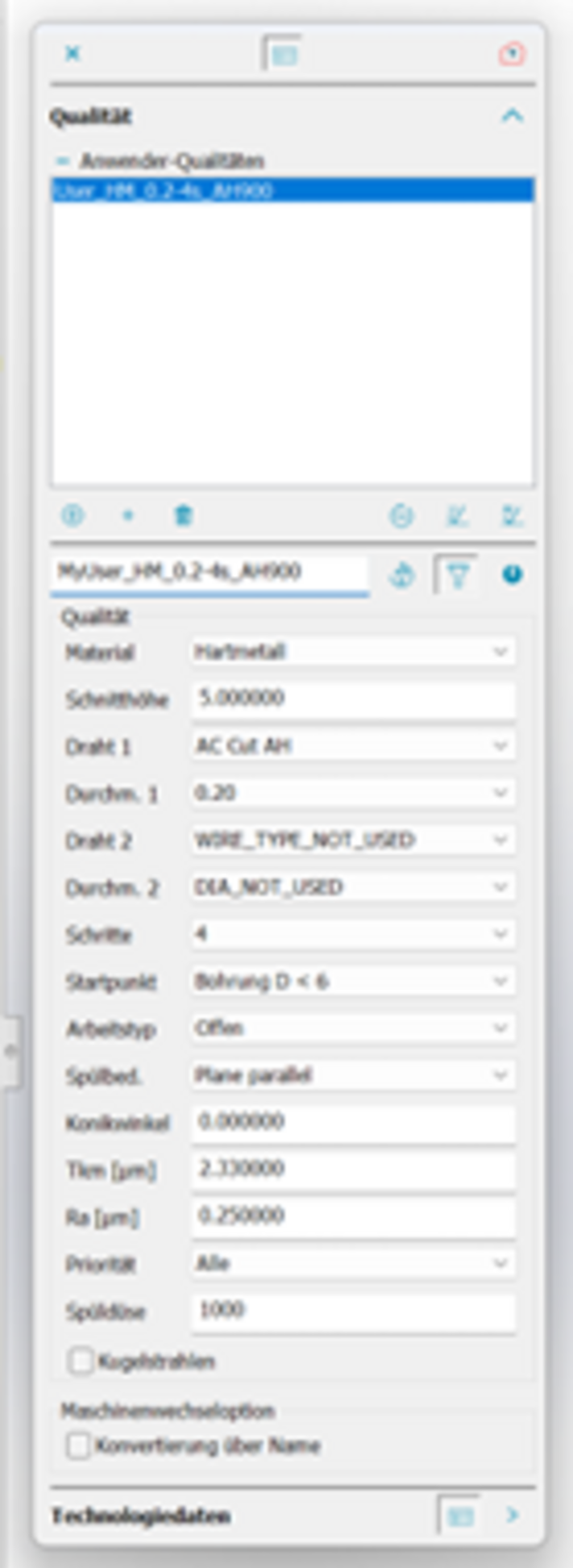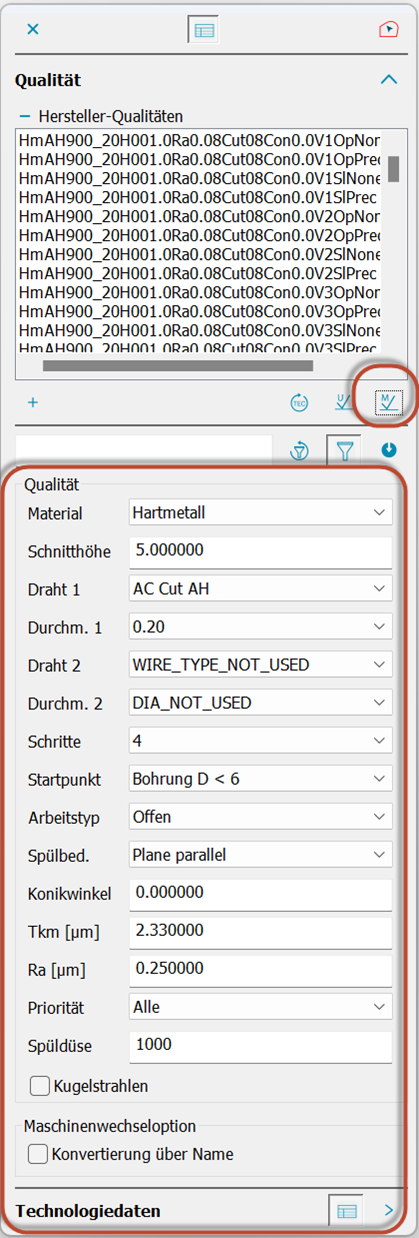 Aufgrund der Größe des Datenbestandes wird diese zur Verarbeitung in DCAMCUT, basierend auf den im Maschinendialog angegebenen Bearbeitungsparametern (Werkstückmaterial, Erodierdraht, Drahtstärke) reduziert und für die Qualitätsauswahl nur der entsprechende Datenbestand angeboten und als Herstellerdatenbank geladen.