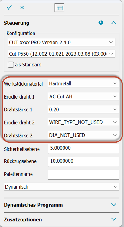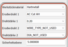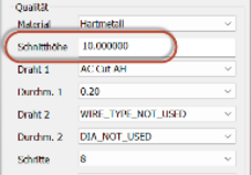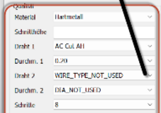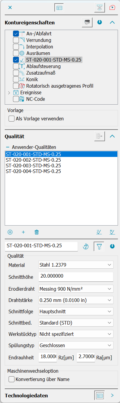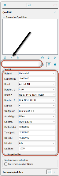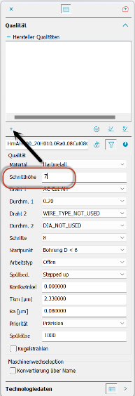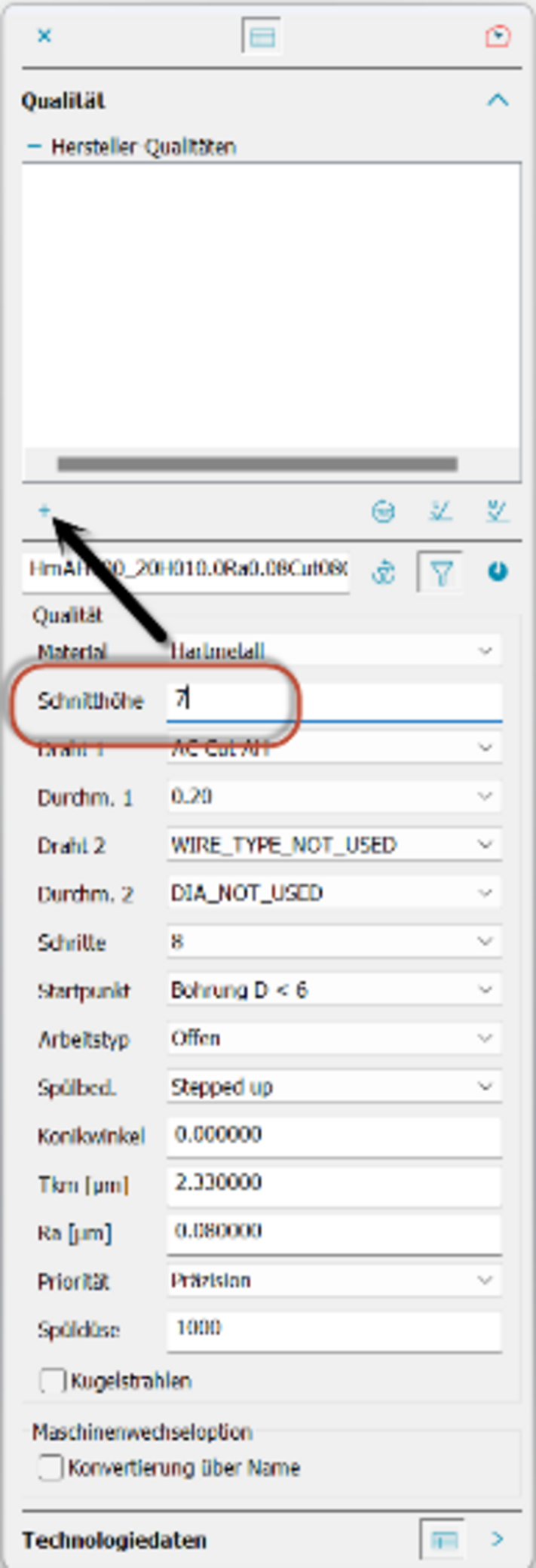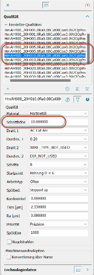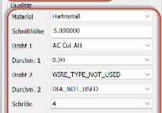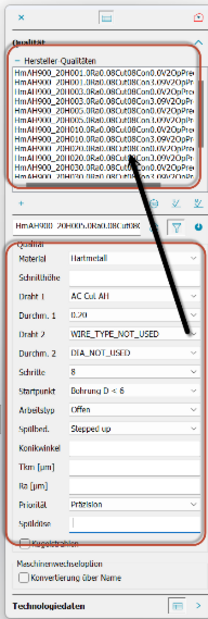 Aufgrund der Größe des Datenbestandes wird diese zur Verarbeitung in DCAMCUT, basierend auf den im Maschinendialog angegebenen Bearbeitungsparametern (Werkstückmaterial, Erodierdraht, Drahtstärke) reduziert und für die Qualitätsauswahl nur der entsprechende Datenbestand angeboten und als Herstellerdatenbank geladen.