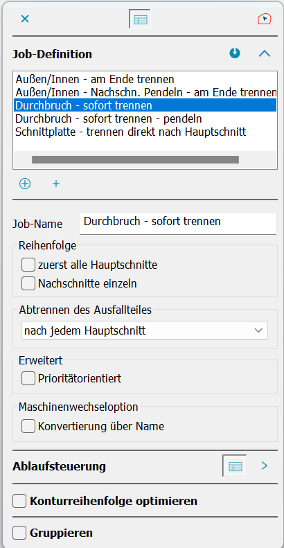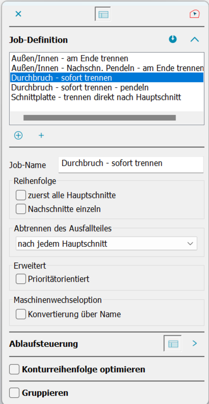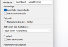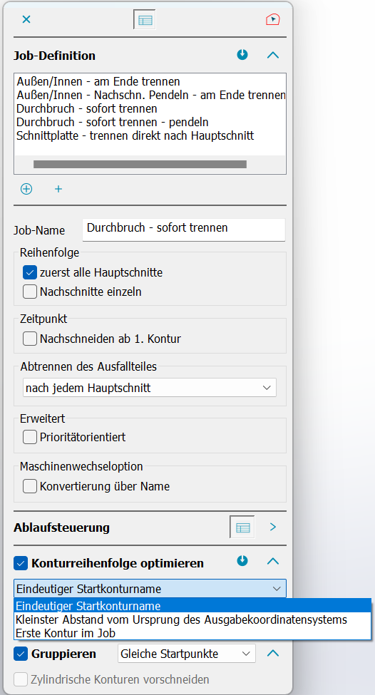 In der Job-Schnittfolge kann die Reihenfolge von Konturen automatisch optimiert werden. Dabei wird die kürzeste Positionierbewegung erzeugt.