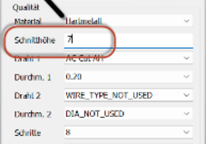 Findet sich die genaue Bearbeitungshöhe nicht im Basisdatenbestand der Maschine, liegt aber im Höhenbereich zwischen zwei in der Liste dargestellten Technologien, kann vom System, genau wie auf der Maschine, eine Nutzertechnologie für diese Zwischenhöhe erzeugt werden. Diese wird automatisch in DCAMCUT übernommen. Die Berechnung der einzelnen Parameter beruht auf einer durch GF zur Verfügung gestellten Interpolationsvorschrift, die identisch mit der in der Maschine ist.