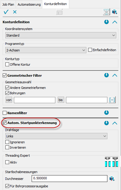 Die ‚Automatische Startpunkterkennung‘ aus dem Dialog ‚Einstellungen‘, befindet sich jetzt im Dialog ‚Konturdefinition‘. Vorhandene Startpunkt-Skizzen, werden automatisch erkannt. Neu ist auch, dass die Startpunkteigenschaften, wie z.B. Durchmesser, Drahtlage usw., direkt mit angeben werden können.