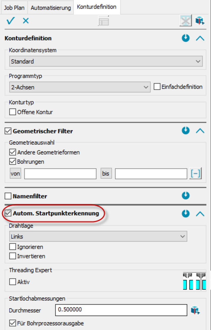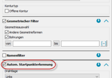 Die ‚Automatische Startpunkterkennung‘ aus dem Dialog ‚Einstellungen‘, befindet sich jetzt im Dialog ‚Konturdefinition‘. Vorhandene Startpunkt-Skizzen, werden automatisch erkannt. Neu ist auch, dass die Startpunkteigenschaften, wie z.B. Durchmesser, Drahtlage usw., direkt mit angeben werden können.