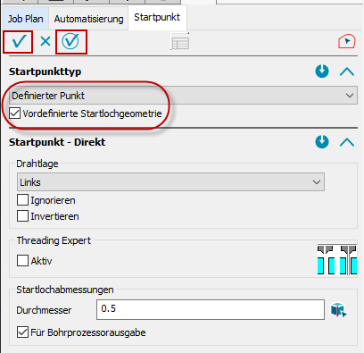 Die Startloch-Skizze muss nicht mehr ausgewählt werden - sofern eine vorhanden ist, nach Bestätigung mit OK/Übernehmen wird diese automatisch erkannt. Auch hier ist neu, wie bei der Automatischen Startpunkterkennung, dass man die Startpunkteigenschaften, wie z.B. Durchmesser, Drahtlage usw. direkt mit angeben kann.