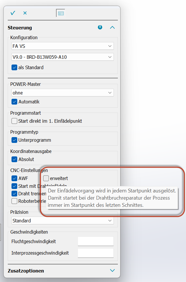 Zusätzlicher Parameter “erweitert” zur Steuerung der Ausgabe des Wiedereinfädelpunktes