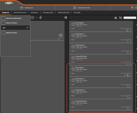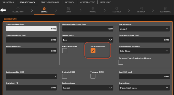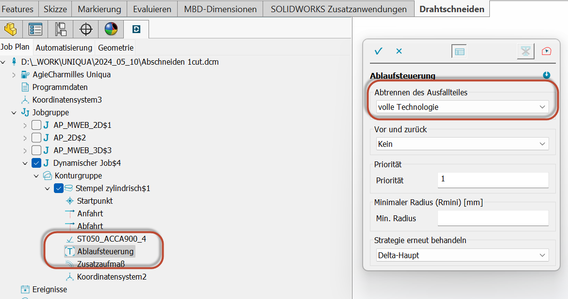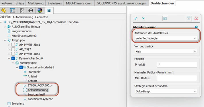 Die dynamischnen Jobs der Uniqua werden in der Ablaufsteuerung um den Parameter “Abtrennen des Ausfallteiles” (ein Schnitt, volle Technologie) erweitert.