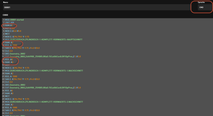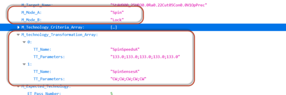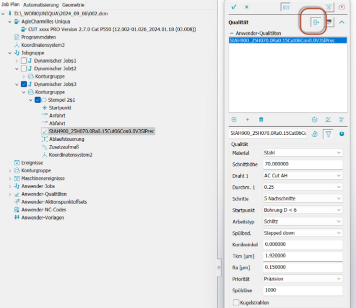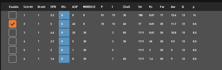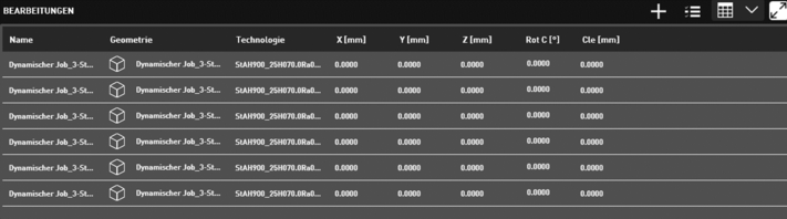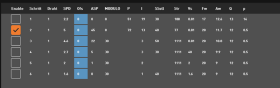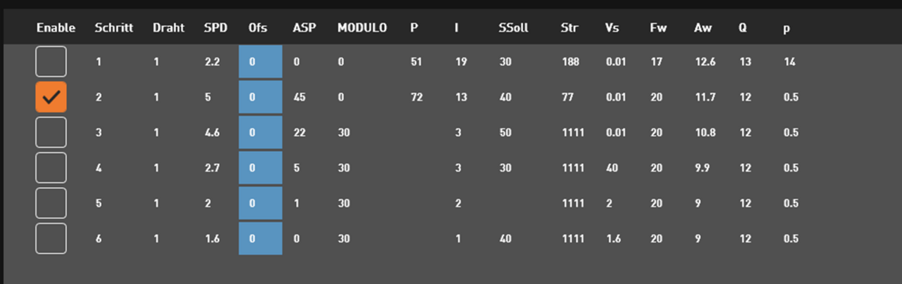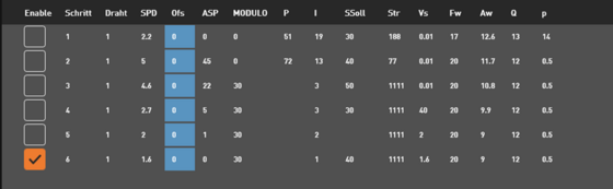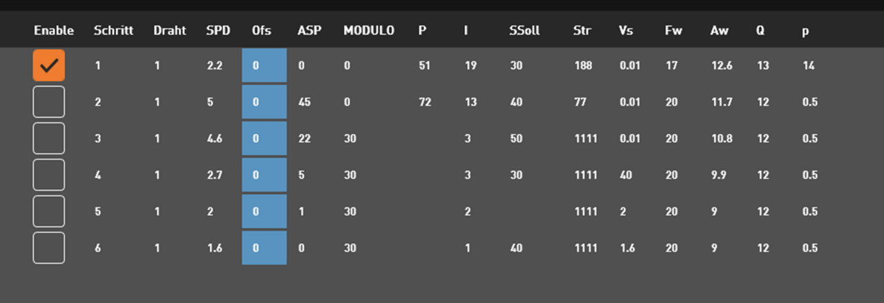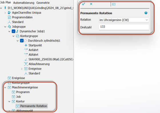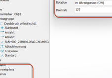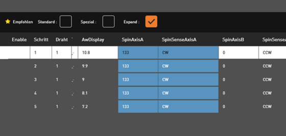 Drehzahl und Drehrichtung der Rotationsachse werden an der Maschine in der jeweils zugeordneten Technologie schnittspezifisch hinterlegt: