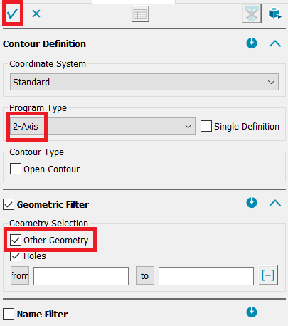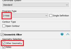 For completeness, the geometry selection 'Other geometry shapes' has been added to the 2-axis contour definition dialog. Without explicit geometry selection, it is now possible to define only holes, without holes or everything.